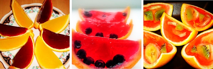 Потом отвар, желатин и апельсиновый сок смешиваем. Половинки апельсинов наполняем получившимся отваром и ставим в холодильник до полного застывания: желе должно дрожать, но не выливаться.