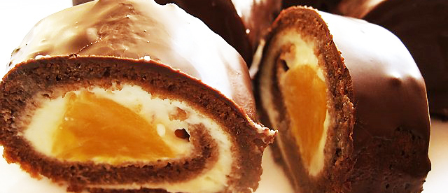 Теперь делаем начинку: 200 мл сливок 35% жирности взбиваем с 200 г пастообразного творога, добавляем сахарную пудру по вкусу. Хорошо взбиваем и начинаем намазывать блинчики по всему диаметру. Поверх творога кладем консервированные дольки персика, примерно посередине блина. Сворачиваем все в рулончик, нарезаем на небольшие порции. Края обрежьте, чтобы они были ровными. Если вы будете использовать свежие фрукты, имейте в виду, что груша в сочетании с творогом горчит, хороший вкус дают киви и бананы. И не кладите какао порошка больше нормы - блины станут горьковатыми.