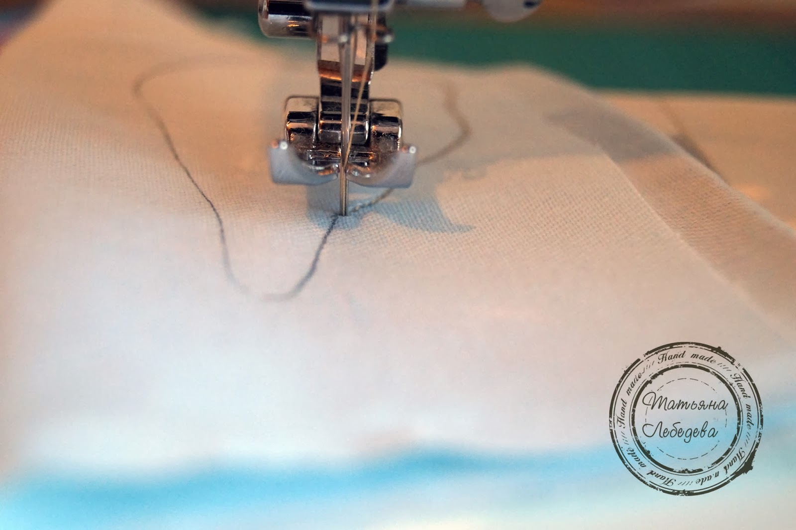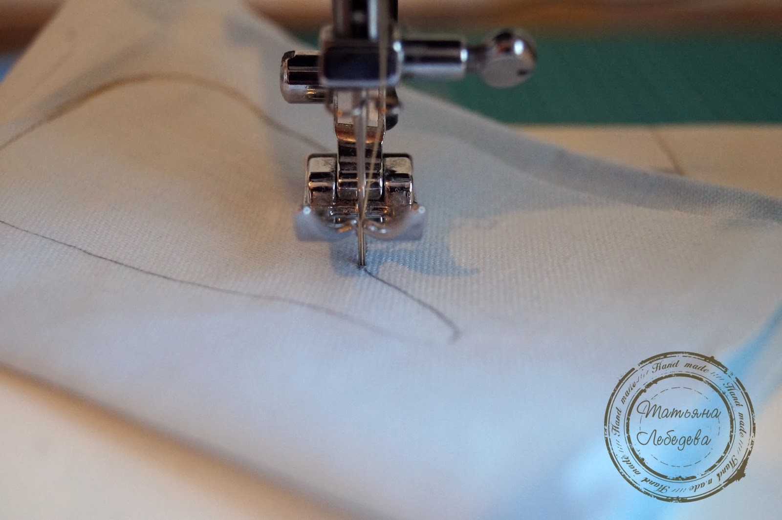 Поворачиваю наколотую на иглу ткань, опускаю лапку и продолжаю строчку по контуру.