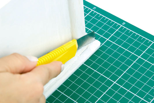 Вырезаем тонкий пенопласт по размеру декорируемой поверхности