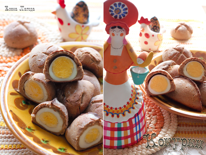 Кокурки — это старинное северо-русское блюдо. Да в общем-то не то, чтобы блюдо, просто бездрожжевой хлебец, запеченный с вареным яйцом. Название происходит от слова кокош — так в древности называли курицу наседку (отсюда и кокошник, кстати). В старину кокурки готовили в дорогу — просто и сытно. А главное удобно — чистить яйца не нужно, они не побьются. Тесто может быть любым, но традиционно на сметане — ржаное. Очень вкусно с соленым огурчиком.