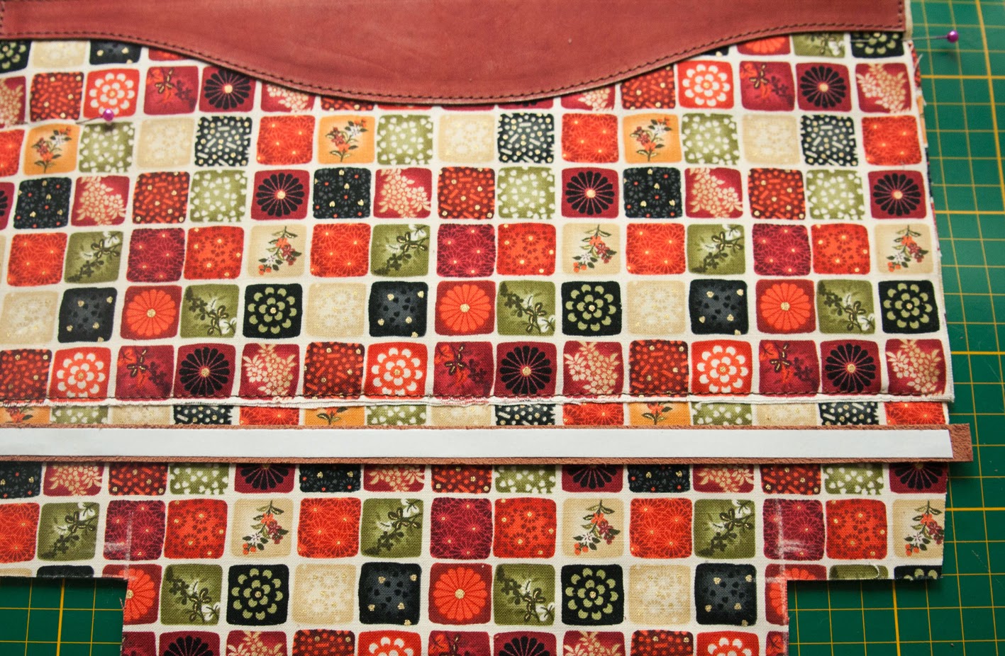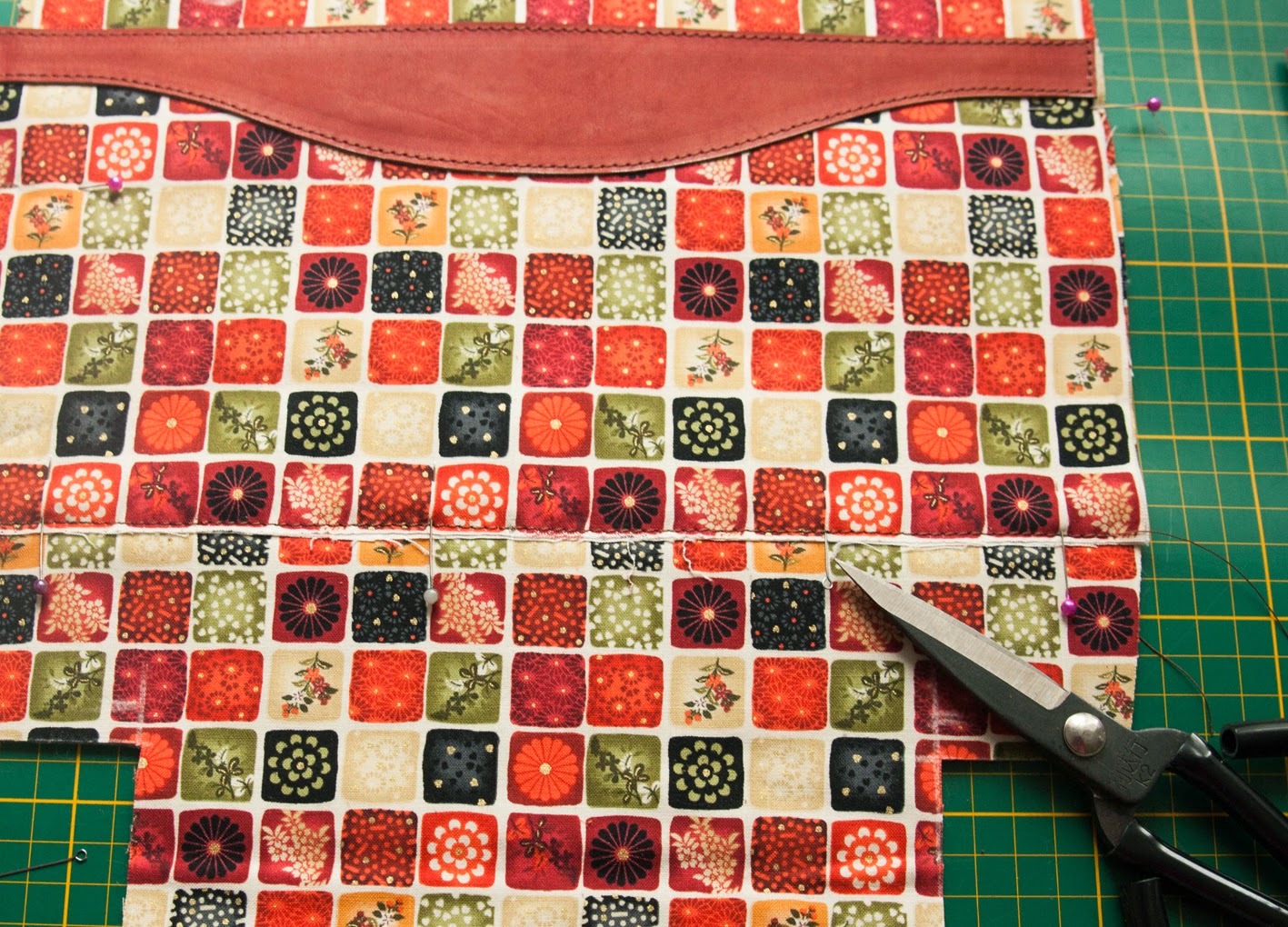 Карман накладываю примерно на 7см от верхнего края сумки, прикалываю булавками по бокам и низу, настрачиваю по низу, совмещая рисунок.