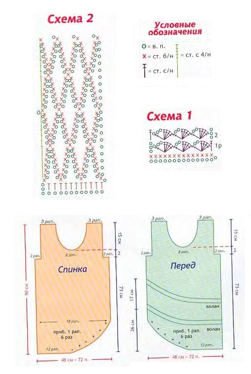Сборка платья: Детали наколоть на выкройку, увлажнить и дать им высохнуть. Выполнить швы. Вырез горловины и проймы обвязать 2 р. ст. б/н. Связать 2 волана узором по схеме 2 и пришить к переду (см. чертеж и фото).