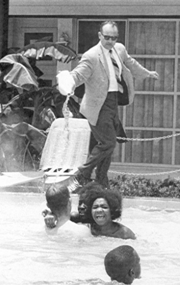 Владелец отеля выливает кислоту в бассейн, в котором купаются афроамериканцы. Калифорния, 1964 год.