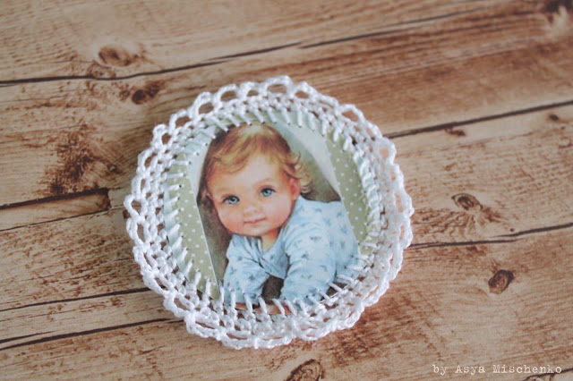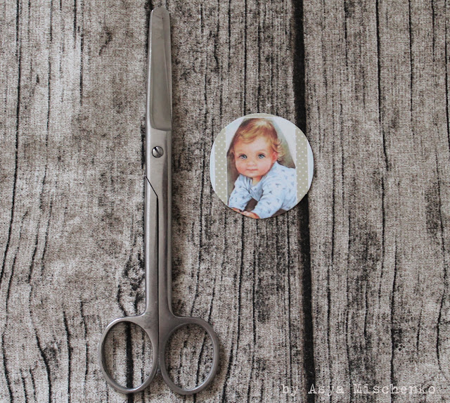 Теперь приклеиваю картинку так, чтобы она при закрытых створках была хорошо видна в овальном отверстии. Затем думаю, как будет выглядеть у меня пространство внутри овала. Я решила декорировать его той же скрапбумагой, что и на створках, но у меня остались только кусочки, поэтому подбираю кусочки так, чтобы в окошко они были видны, а позже подрежу по краям так, чтобы они не выглядывали из-под центральной детали.