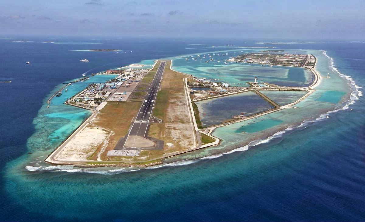 Международный аэропорт Мале расположен на отдельном острове — Хулхуле (Hulhule), который находится всего в 2 км от острова-столицы. Аэропорт принимает рейсы из Москвы, Коломбо, Катара, Дубай, Тривандрама, Вены, Куала-Лумпура и других городов. В терминалах есть все необходимые для туриста услуги: банкомат, банк, аптека, интернет, камера хранения (~3 USD в день). Причал, от которого отправляются паромы к Мале находится справа от выхода из аэропорта. Паромы отправляются каждые 10-15 минут в течение дня (1 USD), и каждые полчаса вечером (2 USD).