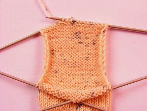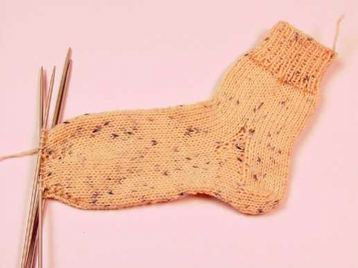 Через 20-21-22 см от наборного края оставить первые 12-13-14 п. на спице, след. 30-32-34 п. перенести на доп. спицу (верхняя часть носка) и оставить последние 12-13-14 п. на спице. Вязать лицевой гладью на высоту 5-5½-6 см, поставить маркер и далее выполнить формирование пятки (см. описание выше).