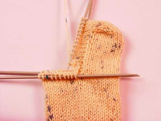 Необходимо поочередно повторять шаги 7 и 8. В итоге на спице должны остаться петли со средней части – 8 петель. Вязание заканчивается лицевым рядом. Затем спицей, на которой находятся петли со средней части, нужно набрать новые петли по краю из кромочных пятки – 10 петель.
