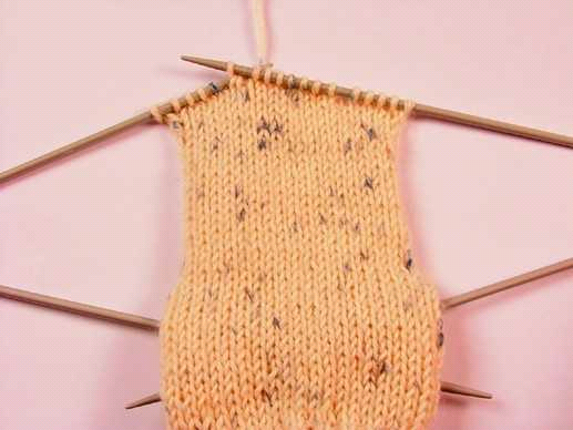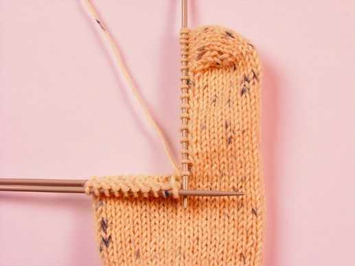 Рабочей спицей нужно провязать 10 петель с первой спицы и 10 петель со второй спицы. Затем свободной спицей требуется набрать 10 петель по краю из кромочных пятки. Этой же спицей нужно провязать 4 петли со средней части.