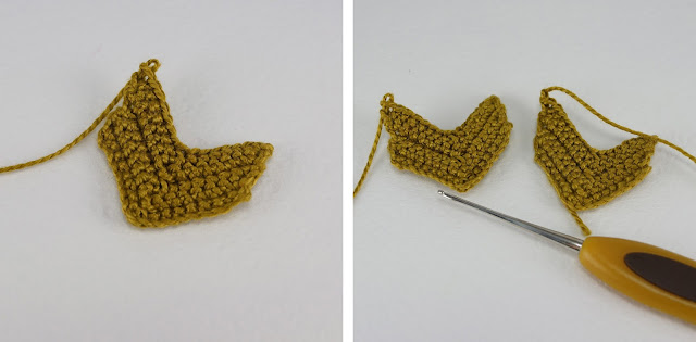 7 ряд: провязать 20 сбн по первой чашечке. Затем пропустить 4 сбн второй чашечки и провязать 20 сбн по кругу второй чашечки (40)