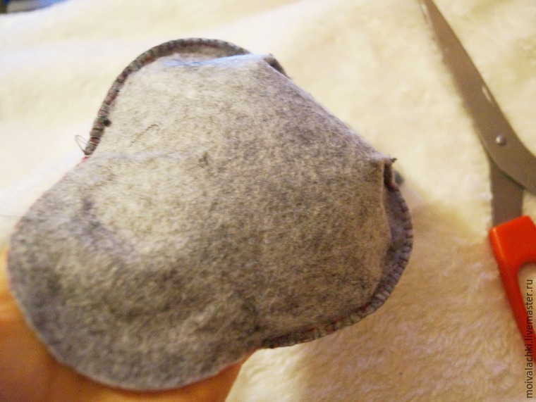 3. You will also need to cut 20-22 teeth pieces from the white felt. I cut 22 equilateral triangles of 1.5" with a small .5" rectangle on the end of one side, so I could sew the teeth on easily.