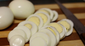 Шаг 4:Отваренные вкрутую яйца (10 минут) нарезаем продолговатыми полосками.