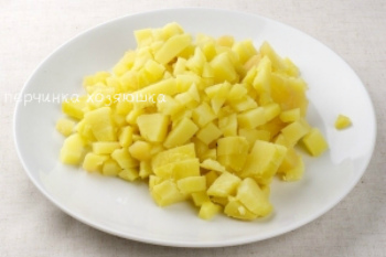 Отварить картофель яйца и куриное филе .Нарезать кубиками картофель.