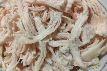 Куриное филе отварить, грибы нарезать пластинками, поджарить вместе с мелко нарезанным луком.