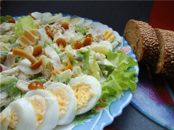 Яйца все я не стала смешивать с салатом, а решила 2 штуки нарезать крупно на кружки и положить с бок.
