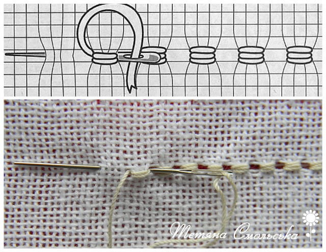 Потім згинають полотно вздовж промережаної лінії і скріплюють зубці між собою з допомогою "черв'ячка". Для цього вишивальну нитку закріплюють справа, голку вколюють з вивороту і виколюють на лицьовий бік, відокремлюючи чотири нитки, які утворюють зубець. Далі нитку протягують між зубцями і вколюють голку через чотири нитки для наступного зубця.