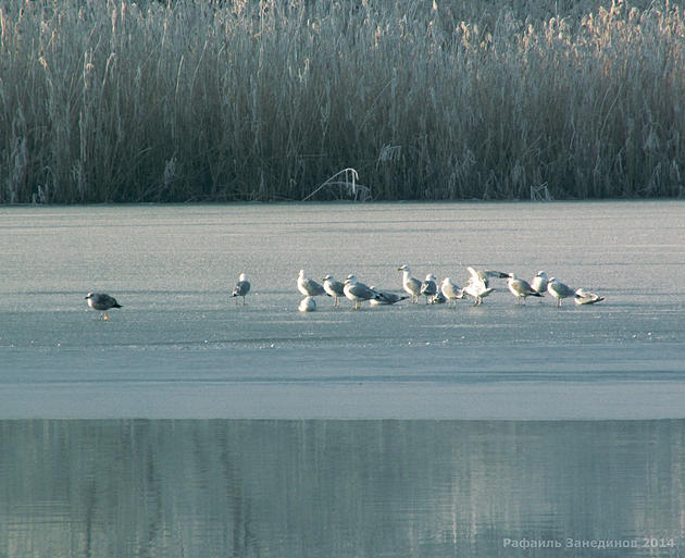 На льду уютно расположилась стая чаек. Сфотографировать их совсем непросто. Как только человек с камерой появился на берегу, птицы взволнованно начали хлопать крыльями, собираясь взлететь. Делаю снимок с расстояния метров в сорок, жалея, что камера у меня без телеобъектива. К красавицам, которые сидят точно в центре пруда подобраться нельзя никак.