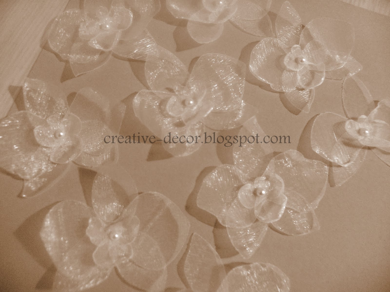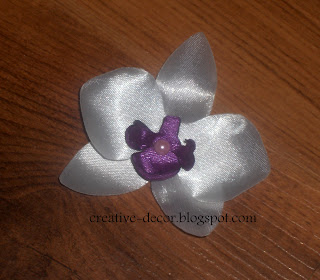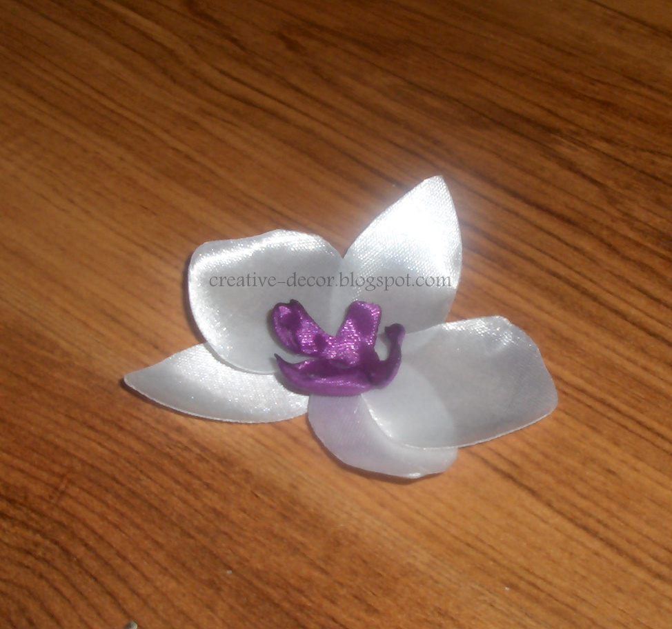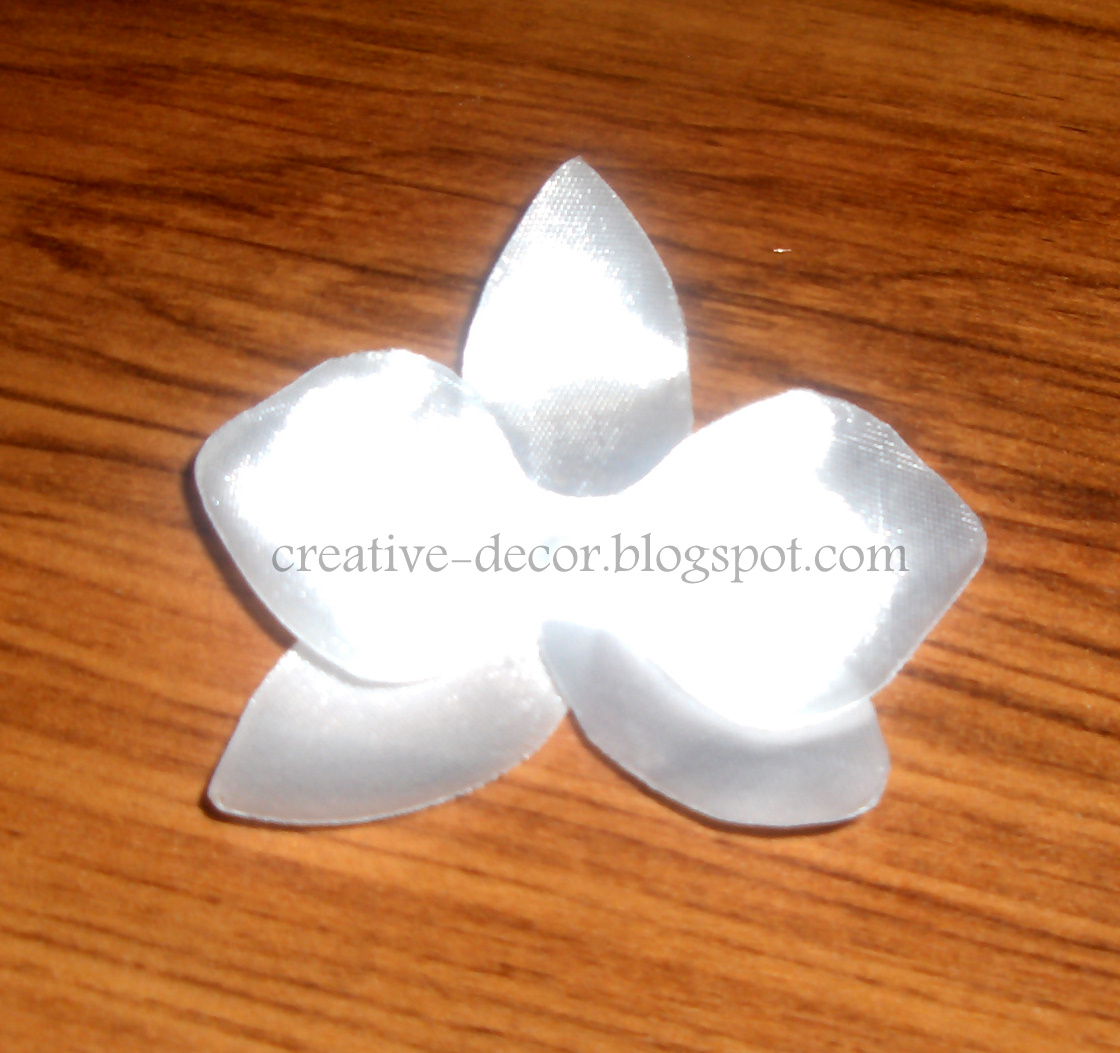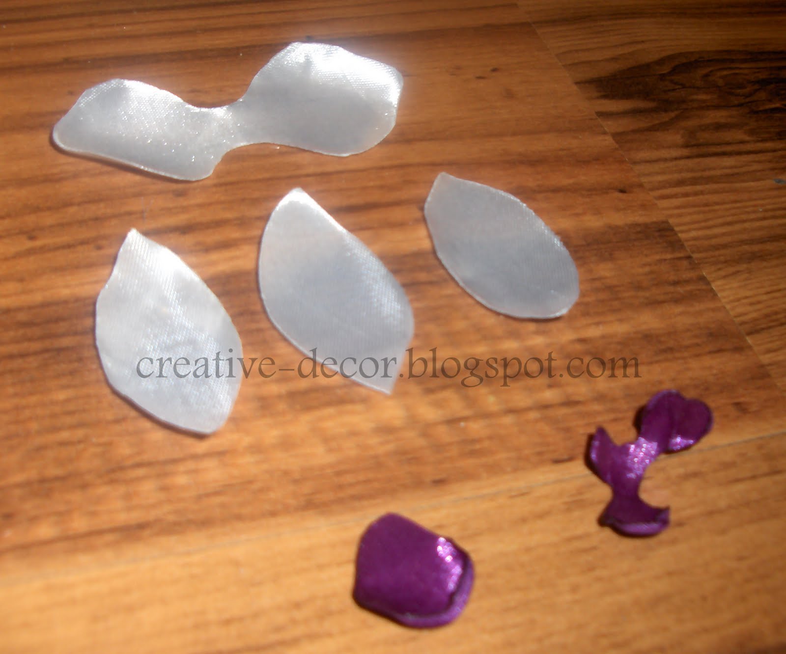 2. Затем обжигаем все края зажигалкой. Белые лепестки сильно не скручиваем. Просто слегка проводим огнем по лицевой стороне, чтоб лепесточки немножко загнулись. Я держала лепесток в руке, лицом вниз и снизу на дальнем расстоянии водила зажигалкой. Фиолетовые лепестки загибаем посильнее, т.к. надо чтоб они скрутились. Получится вот так: