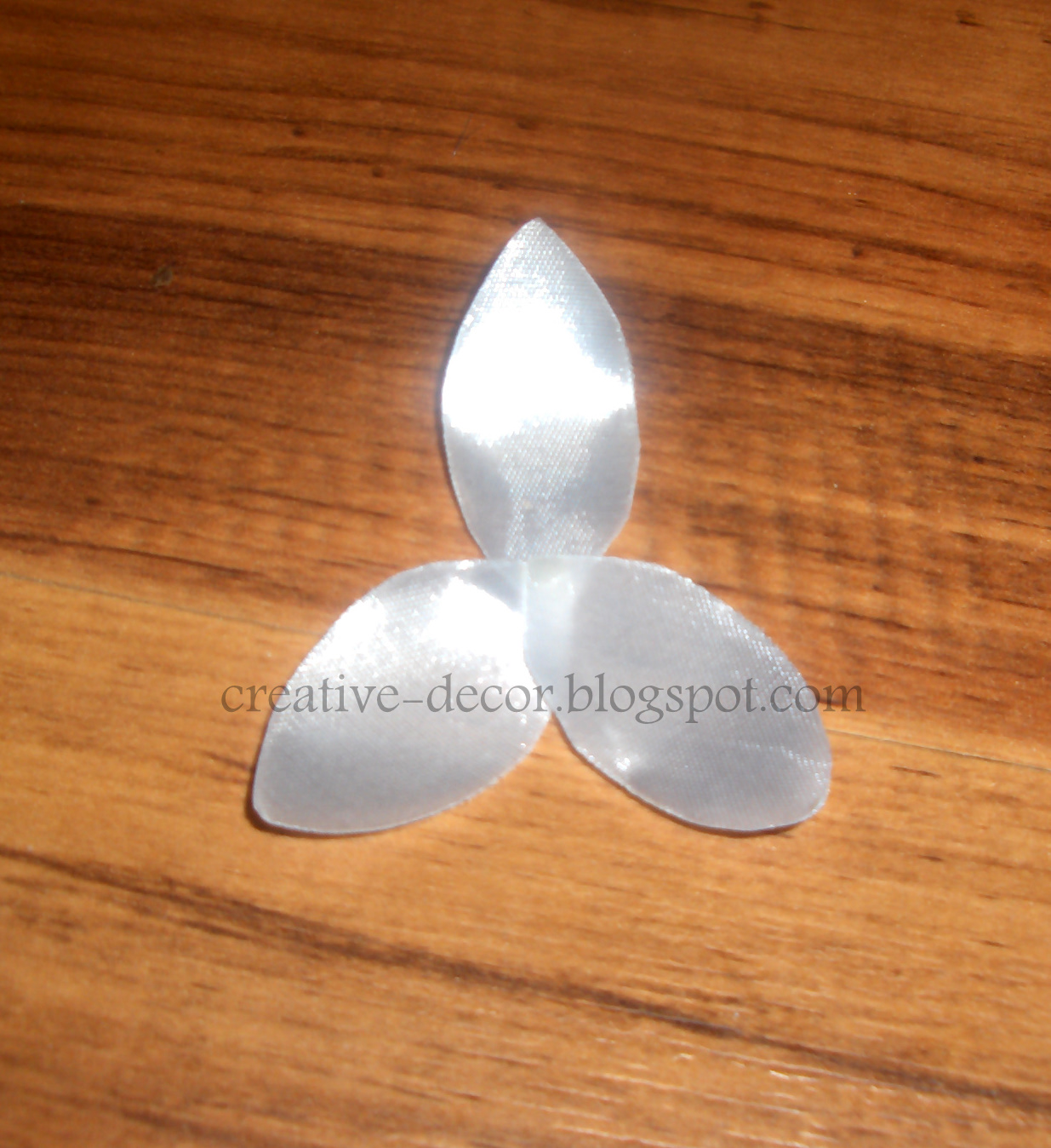 3. Затем начинаем сборку. Три лепестка соединяем вместе с помощью капелек клея. Вот таким образом: