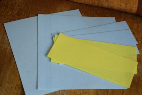 Вырезем из фетра 2 больших одинаковых прямоугольника и 4 прямоугольничка поуже и покороче ( это будущие кармашки они будут внутри и снаружи сумочки)