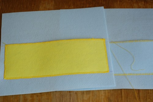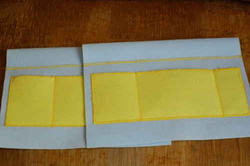 Прострачиваем отделения кармашков и и делаем верх сумочки , отгивая часть фетра на 4-5 см и прострачиваем, внутри вырезаем отверстие для ручек.