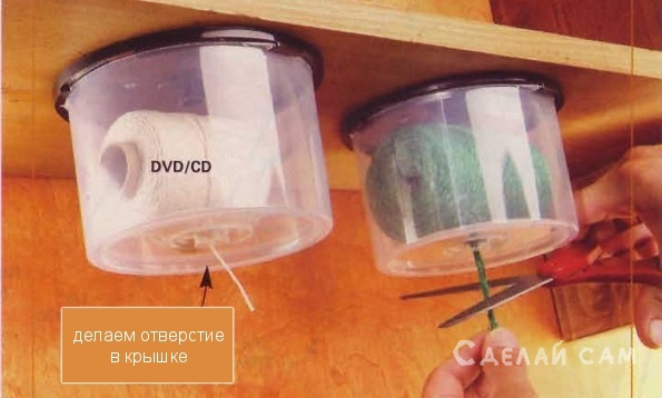 Также на втором фото приспособление из той же упаковки от CD - держатель ниток. Это будет полезно швеям и рукодельницам по вязанию. Также упаковку прикручиваем (шурупами, или пристреливаем степлером) к полочке, а в нижней части посередине делаем отверстие для ниток.