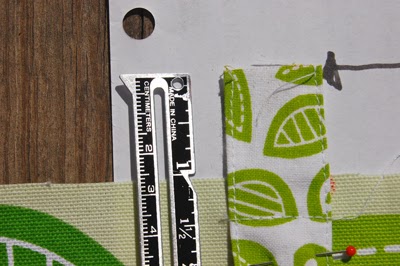 Теперь мы будем пришивать кармашек к спинке кармана для прищепок. Для того, чтобы пришить кармашек ровно относительно нижнего среза спинки, я поступаю так: на изнанке линейкой отмеряю одинаковые отрезки от нижнего среза детали спинки (у меня – 15,5 см), и ставлю точки, соединяю точки в линию – это линия верхнего среза кармана.
