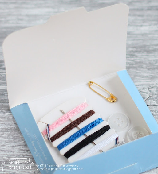 Такой набор, кстати, меня и вдохновил, во всяком случае в части формы игольницы и бобинки для ниток точно он. :-) Пуговки и булавка в маленьком пакетике лежали — так всё же надёжнее.
