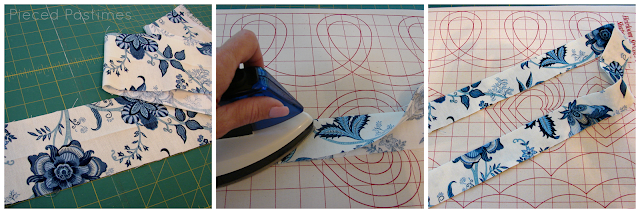 Для начала выкраиваем косую бейку под углом 45 градусов шириной 3,5 см, лапку использую 1/4 дюйма, в итоге оформленный край получается 8 мм.