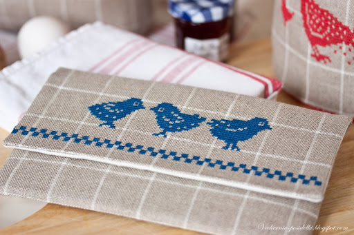 Из обрезков льна получился небольшой чехол-конверт. В него можно сложить приборы, салфетки и прочую мелочь. Цыплята на клапане вышиты, для разнообразия, синим мулине.