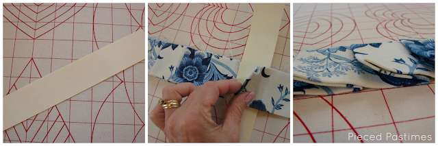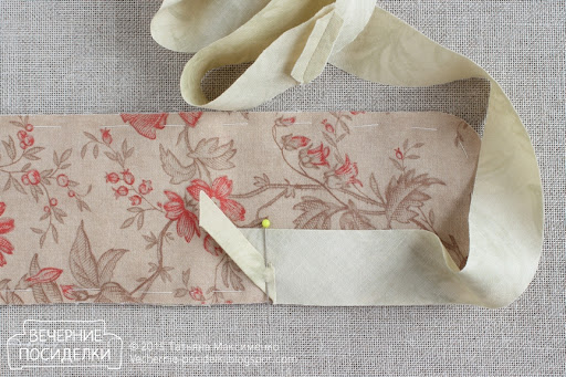 14. Для окантовки органайзера по косой (под углом 45 градусов к долевой нити) выкроите бейку шириной 2,5см, длиной около 70-75см. Конец бейки подверните на изнаночную сторону и приколите бейку лицевой стороной к лицевой стороне органайзера.