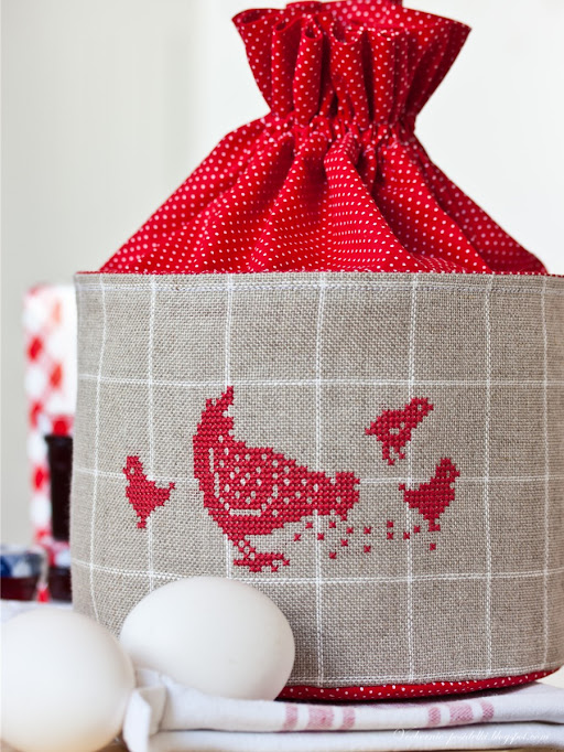 Для хлеба, яиц, сыра, крошечных баночек с джемом и прочих вкусностей я сшила вместительный мешочек с очередной яркой курочкой. Для удобства и устойчивости у мешочка сформировано донышко, а закрывается он на бельевую прищепку – давно хотела осуществить эту подсмотренную в книге идею. Ну а если такой способ закрывания надоест, всегда можно перевязать мешочек обычной ленточкой. Курочка и цыплята выше из книги «Poules et Poulettes» от Sophie Helene.