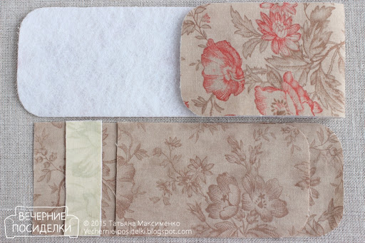 2. По выкройке «Карман для ножниц» выкроите две детали, прибавив припуски на швы 5мм по нижним и наклонным боковым сторонам (на прямых участках боковых сторон прибавки не делайте). Одну из деталей кармана для ножниц продублируйте с изнаночной стороны тонким клеевым дублерином. По выкройке «Карман» выкроите деталь из ткани и деталь из фетра, прибавив припуски на швы 5мм по нижним сторонам. Деталь из ткани продублируйте с изнаночной стороны тонким клеевым дублерином.