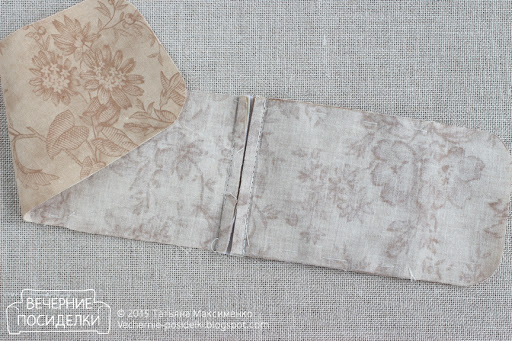 7. Приколите карман к верхней части подкладки, совместив прямую короткую сторону подкладки и нижний срез кармана. Пришейте наклонные участки боковых сторон кармана к подкладке вручную потайным швом. Прямые участки боковых сторон кармана приметайте.