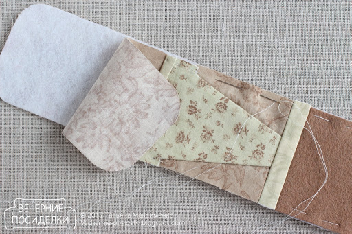 8. Деталь из фетра сложите с изнаночной стороной детали кармана из ткани и окантуйте верхний срез кармана бейкой аналогично этапам №5-6.