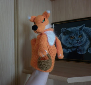 Пришиваешь на месте верхних утяжек глазки, чёрной мохеровой нитью вышиваешь веки, вышиваешь носик: