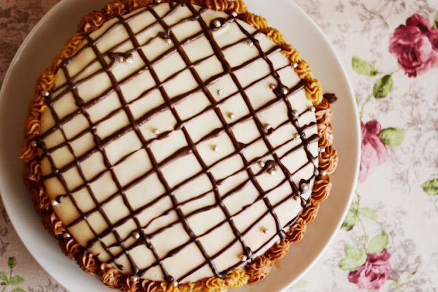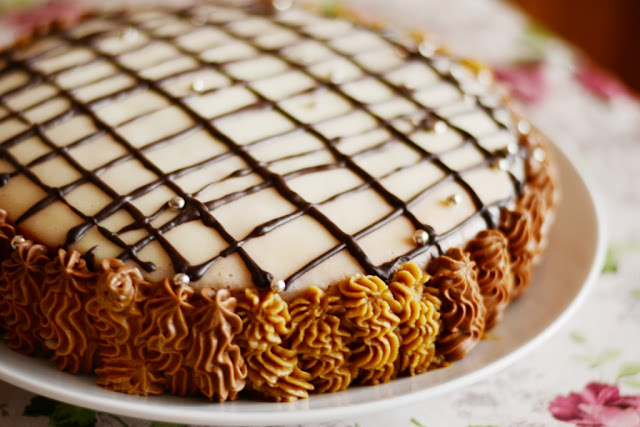 18. Оставшимся масляным кремом украсить бока с помощью кондитерского шприца/мешка (у меня его не хватило, потому пришлось готовить второй масляный крем). Для этого взбить масло добела, добавить остаток первого крема из конд. мешка, остаток шоколадной остывшей (!) глазури, сах. пудру и всё тщательно взбить на максимальной скорости. Переложить массу в конд. мешок и доукрашать бортики торта.
