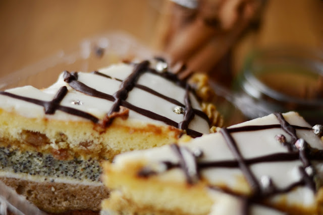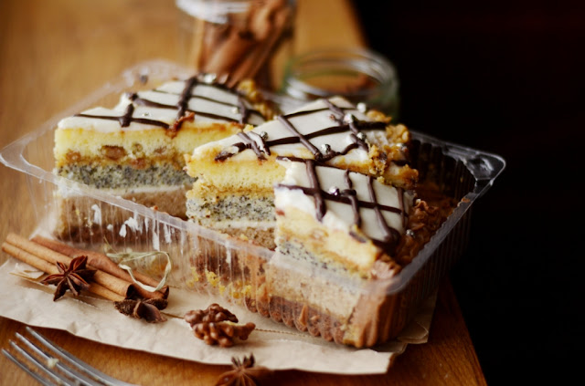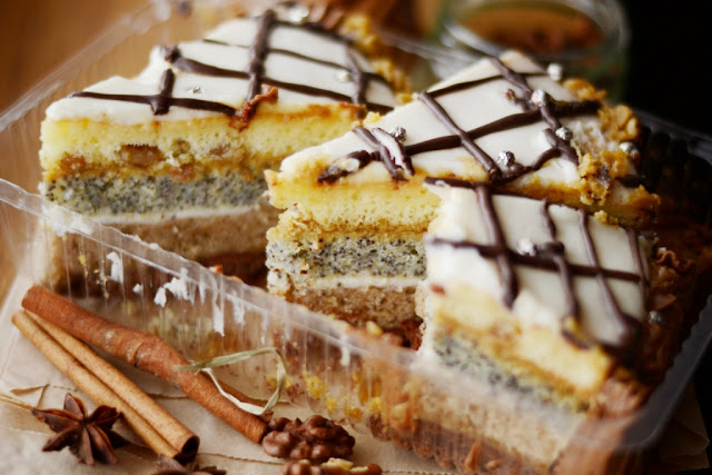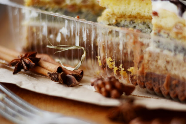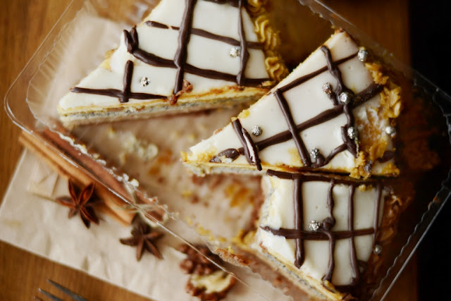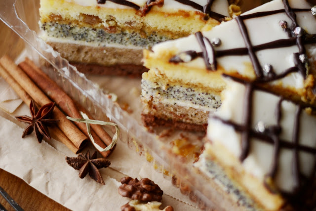 13. Затем очередь макового коржа (тоже пропитанного). Смазать второй половиной масляного крема (не считая тот, что остался для декора).
