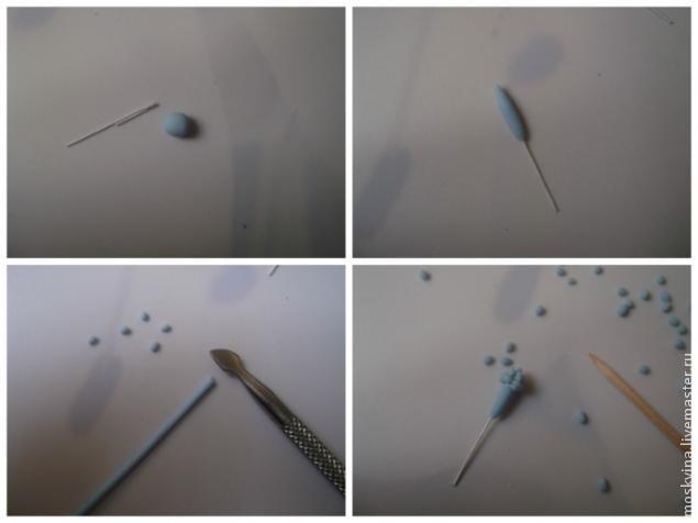 После в оставшийся голубой кусочек глины добавим краску(ультрамарин светлый). Отделяем 10-13 шариков со сп. головку, и как на фото зубочисткой раскатаем бочоночек и острым стеком придавим края, как бы определяя лепестки у цветочка, делаем 5-6 делений.