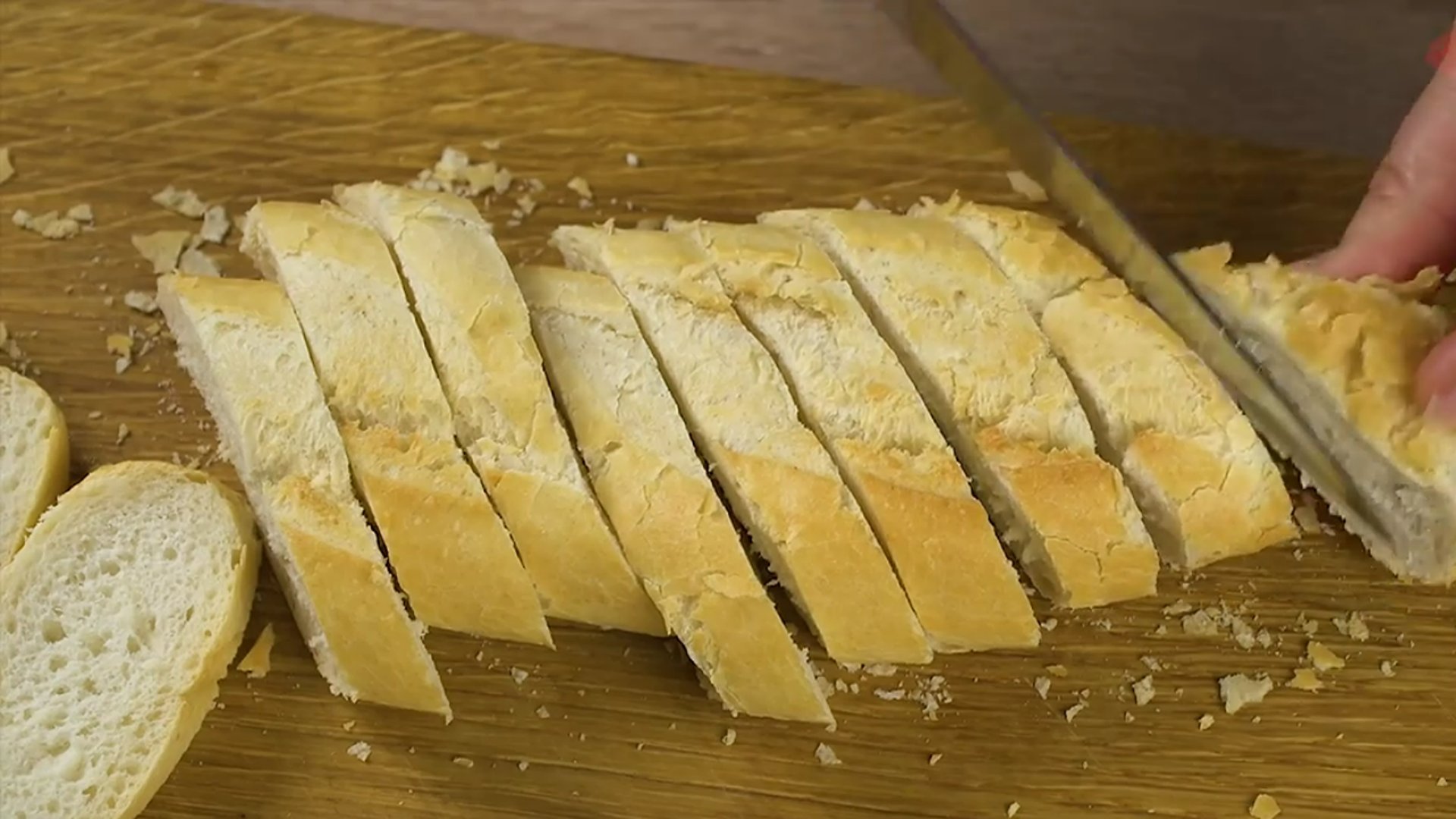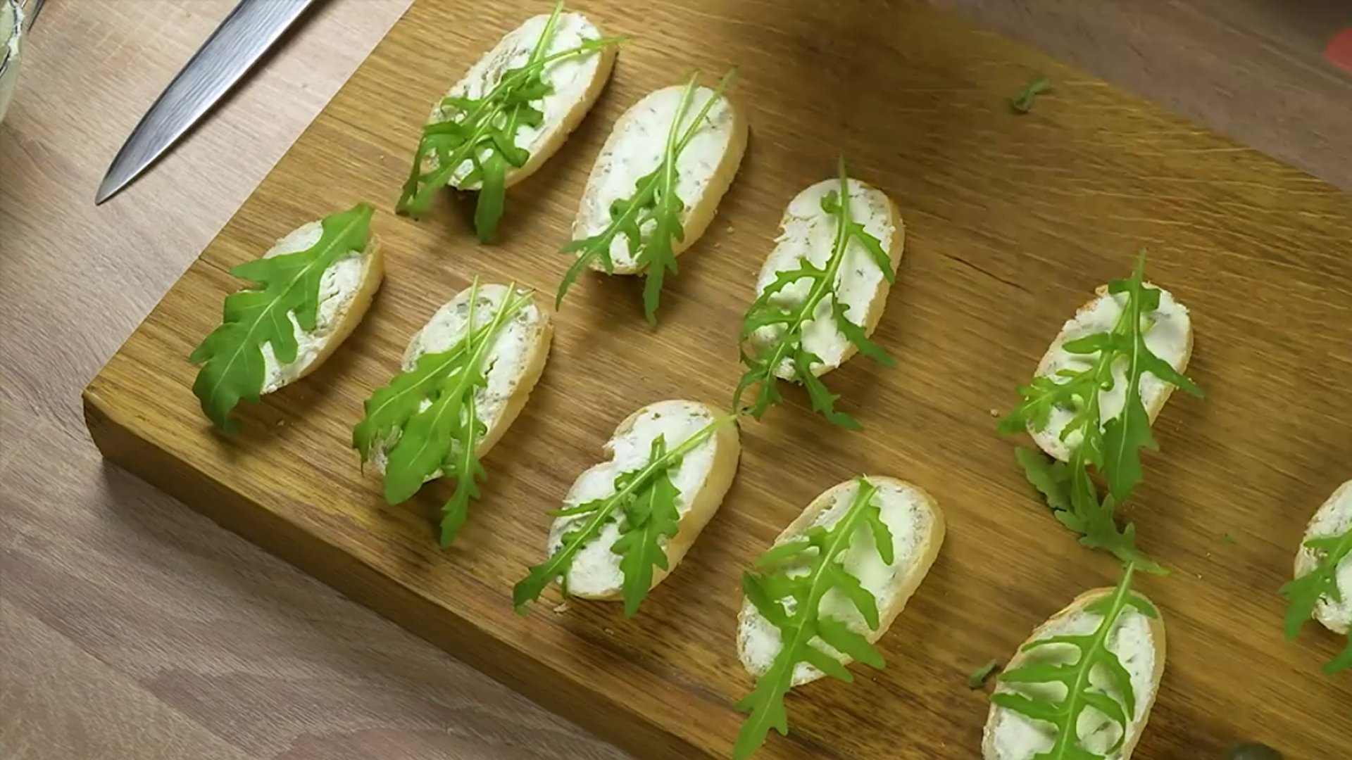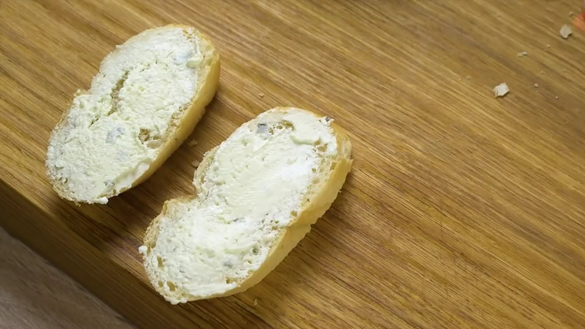 2. Багет нарежем. Каждый кусочек намажем сливочно-творожным сыром.