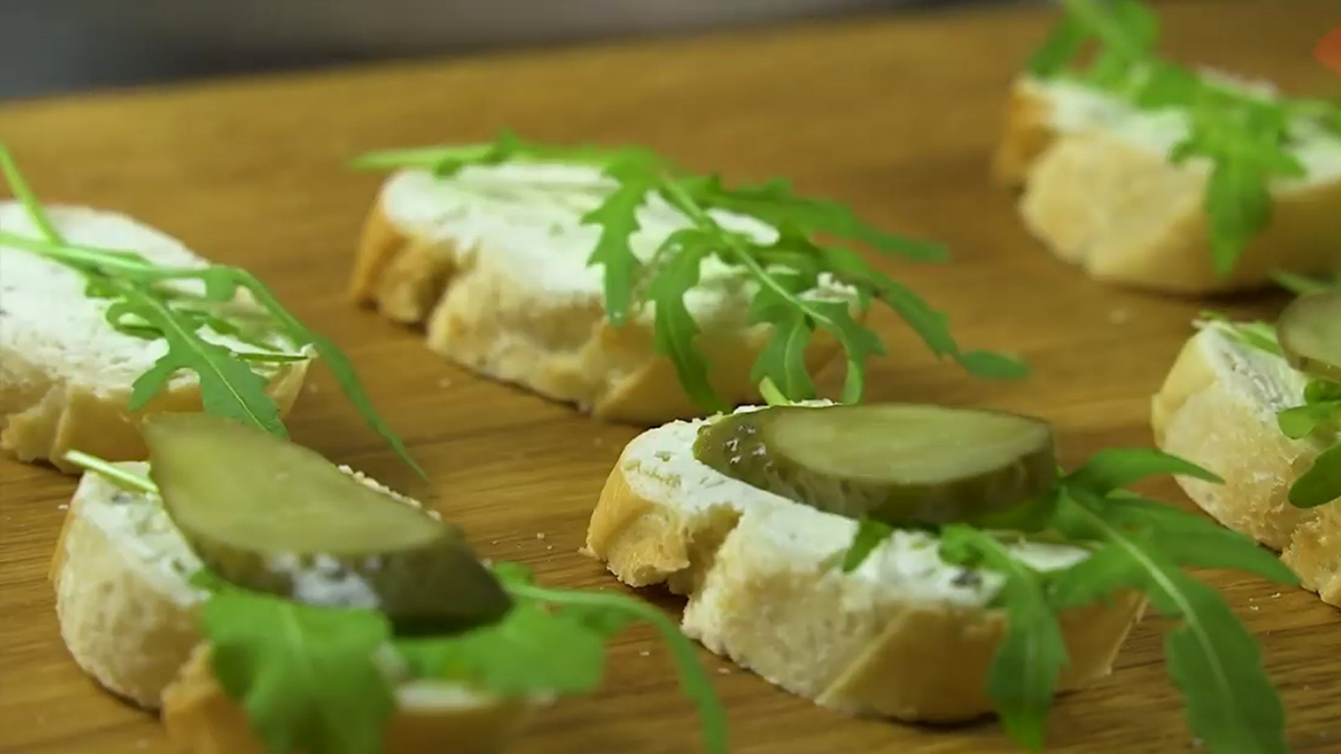 3. Соленый огурец нарезаем на пластинки и выкладываем сверху на рукколу.