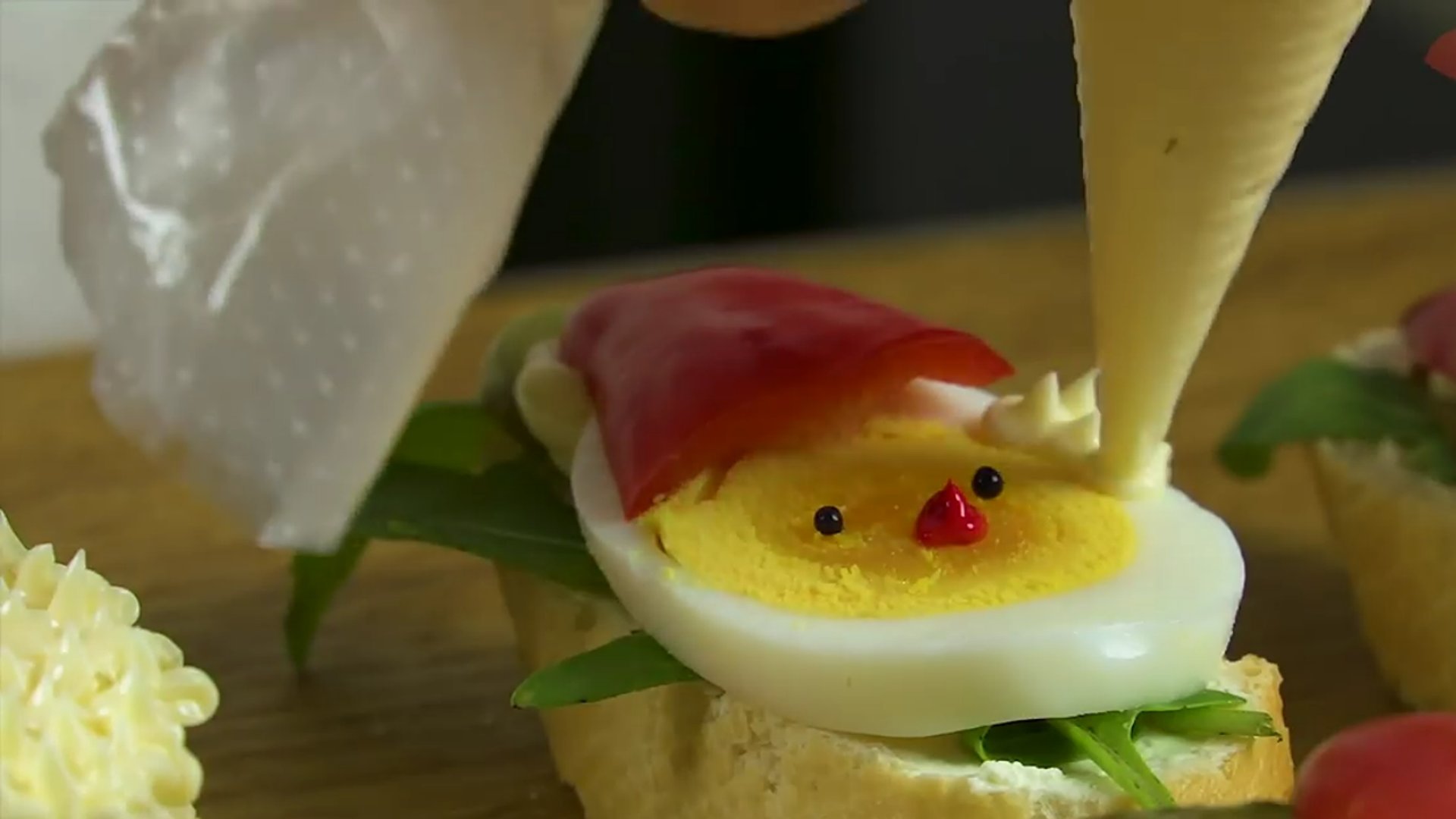 6. Теперь делаем глазки и носик. Для глаз берем черную имитированную икру. А для красного носа можно в майонез добавить красный пищевой краситель или использовать кетчуп если красителя нет под рукой. Чтобы удобно было наносить рисунок, майонез нужно переложить в кондитерский мешок.