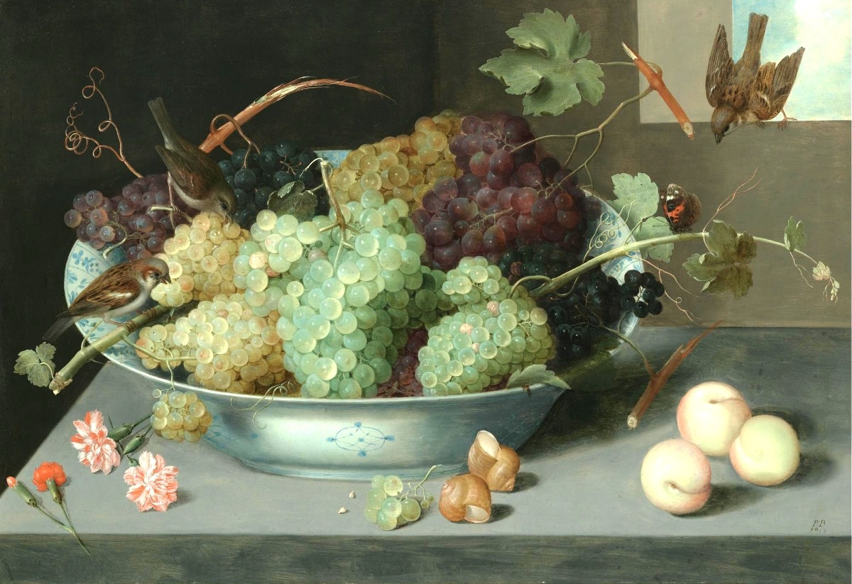 Still life with bunches of grapes in a porcelain bowl, three sparrows, and a butterfly, with peaches and snails on the stone ledge below