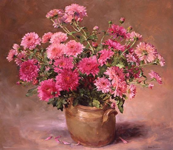 Излюбленное ее направление живописи – натюрморт. Конечно, в числе ее работ есть и «фруктовые» натюрморты, но именно цветы занимают львиную долю ее картин.