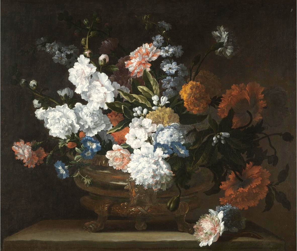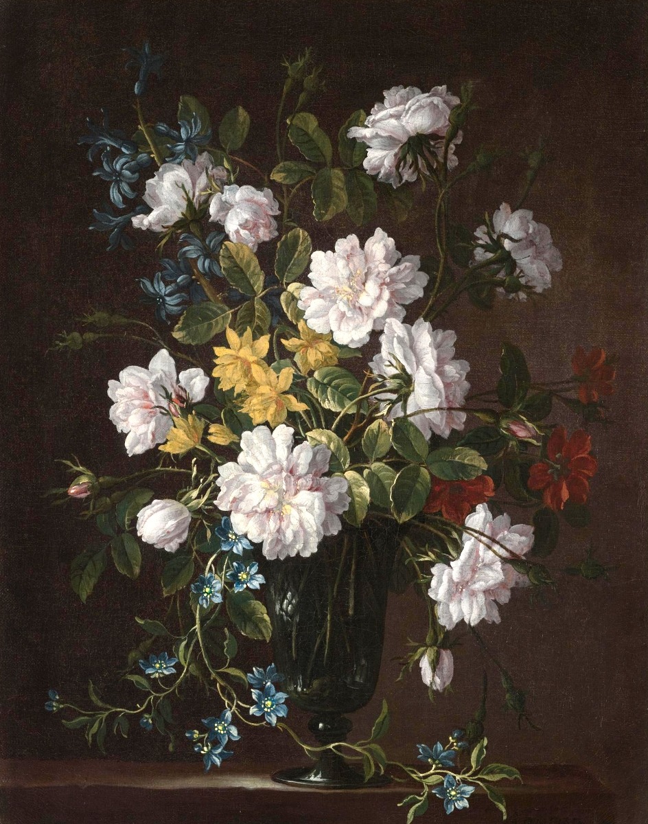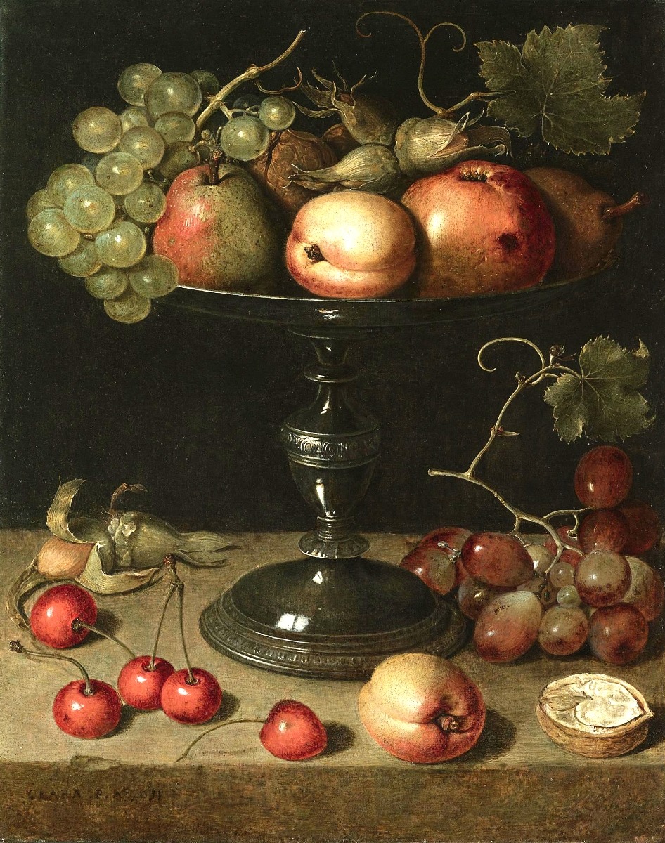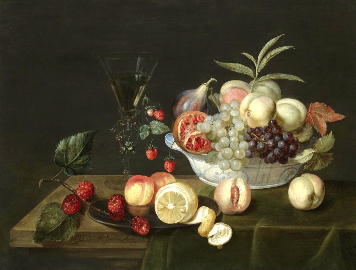 Still life with Grapes, an Open Pomegranate, Peaches and a Fig in a Blue-and-White Wan-Li