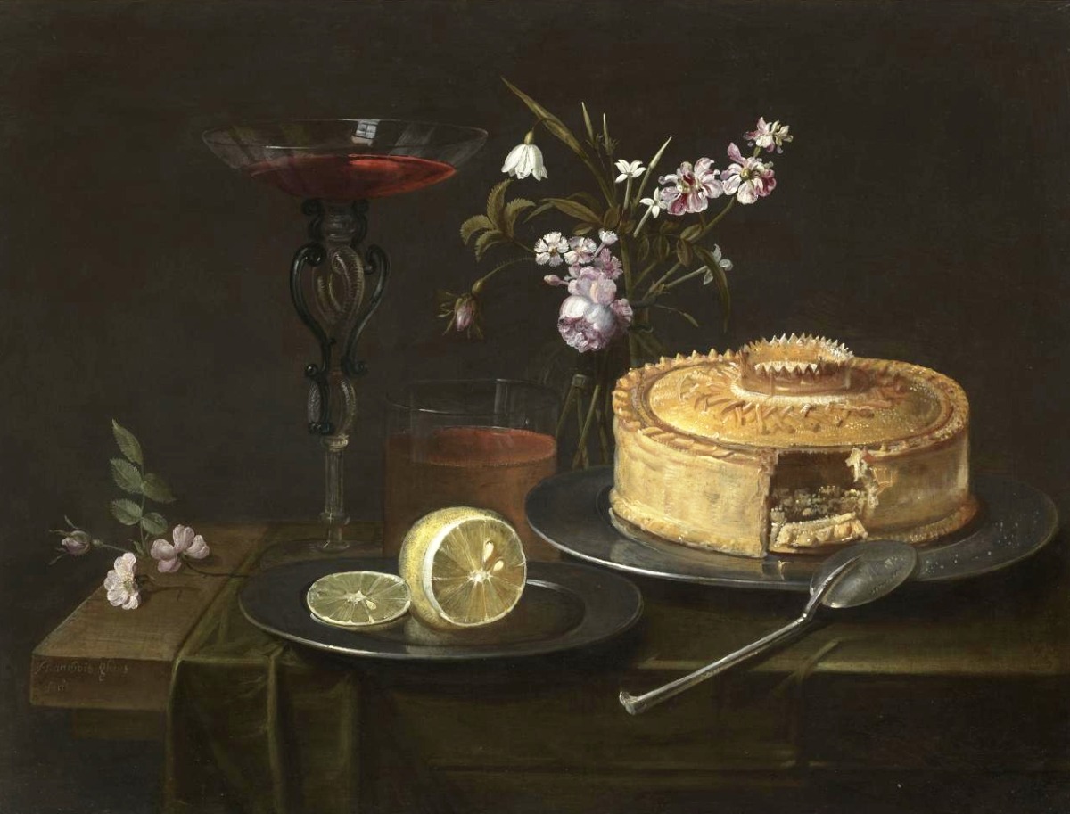 Still life with a meat pie on a pewter plate, a vase of flowers, an elaborate wine glass and a sliced lemon on a wooden ledge