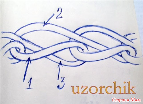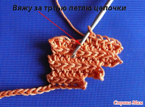 3 - третья нитка петли, проходящая снизу, цепляться за нее неудобно, можно обойтись просто дальней полупетлей, но тогда посередине листика не получится рубчика.