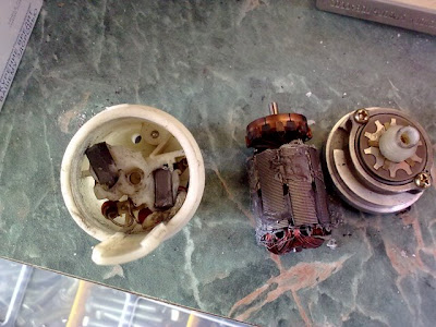 Расплавленная верхняя часть с вплавленными щетками... Вопрос! А почему собссно? В баке бензина было хоть и четверть, но было! И работал он до последнего... Неужели все таки успел поработать насухую? Или это он уже когда заклинил так нагрелся до плавления... предохранитель на реле почему то не сработал...