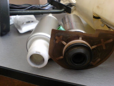 Как видно из фоток из-за разной конструктивной особенности, пришлось взять уплотнительную резинку от старого насоса и поставить ее на всасывающую часть нового, но при этом пришлось извлечь запорную мембрану. Т.е. теперь насос сосет непосредственно из бака. И это основной минус такой конструкции, приходиться не доводить стрелку уровня топлива до красной зоны, а в идеале вообще теперь для меня минимум - это четверть бака, чтоб уж не думалось. Ну а наполняется сама банка из обратки, т.е. перегреваться он тоже по идее не должен. Но не гарантируется при этом герметичность системы (мембрана то снята) и по идее бензин из банки может постепенно стечь... отсюда второй минус - перед тем как запустить двигатель, я даю на включенном зажигании вхолостую поработать насосу секунд 10-15, чтобы он из обратки наполнил банку.