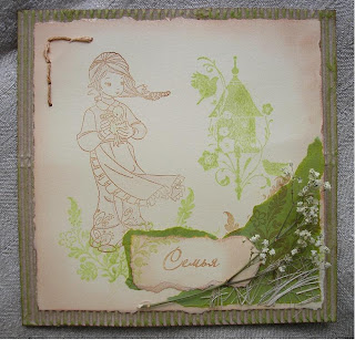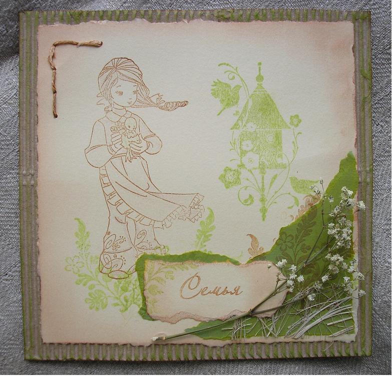 Спасибо девочкам за штампы, которые я выиграла в конфетках - Юле за птичий домик, Ане - за девочку штамп "Семья") Долго думала. стоит ли девочку раскрашивать, решались чуть-чуть придать ей цвет, чтоб просто не потерялась. Акварельных карандашей нет, а купленные еще в прошлой жизни китайские могли бы только испортить рисунок. Но вроде все обошлось)